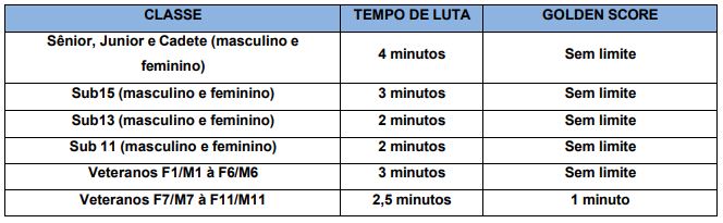 para cada Classe em disputa (Sub 13, Sub 15, Cadete, Junior, Sênior e Veteranos),