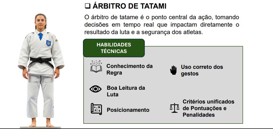 Além disso, os organizadores abordaram as atribuições do Árbitro de Tatame e do Árbitro Supervisor de Área, reforçando conhecimentos sobre as regras já existentes e apresentando as atualizações recentes.