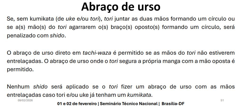 • É permitido o abraço de urso desde de que quando for iniciado o Tori ou Uke esteja com uma das mãos no judogui do adversário.